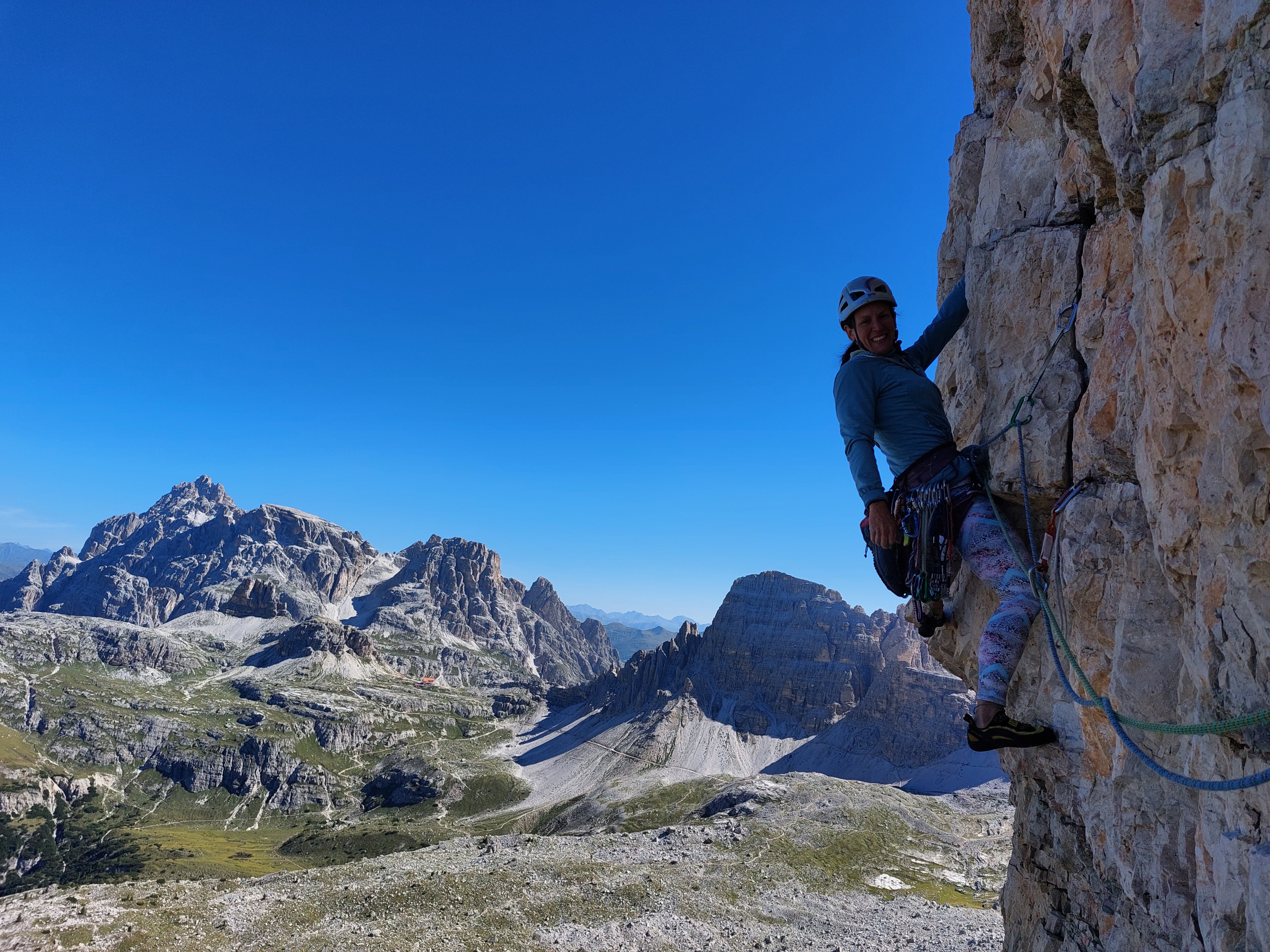 A les 7.30h érem a peu de via a la Cima Grande amb intenció d’escalar la Hasse-Brandler, però ens entren tots els dubtes quan ens adonem que davant nostre ja hi ha 4 cordades! Sense dubte, no hem matinat prou. En Pau proposa apropar-nos a la Cima oest i jo accepto a contracor. Ens posem a la Cassin tot i veure que hi ha algunes cordades que ens treuen força avantatge. De seguida comprovem que tota avantatge és poca i els atrapem abans de començar la mítica i llarga travessia per sota dels sostres. Ja fa estona que he fet un viatge al passat imaginant aquell agost del 1935 i m’he posat a la pell de Cassin i companyia escalant entre un mar de pitons dels quals no m’atreveixo ni a penjar-me. Em toca el llarg de 7a de travessa i surto amb molt de fred. Perdo en Pau de vista a mig camí, així que l’alerto del perill de caiguda perquè veig que tinc una secció difícil, on hi ha un pitó petat i a sota hi tinc un pitó falcat. De sobte un jove de la cordada del davant nostre em diu “Do you want to know something?” i jo responc “yes” tot mirant la fusta podrida. M’indica un parell de cantells salvadors i em fa saber que el seu company ha caigut sobre aquell pitó falcat. “Good to know!” Ho dono tot com si aquell pitó fos un bolt i arribo a la R tan butida que no tinc forces ni per triangular!